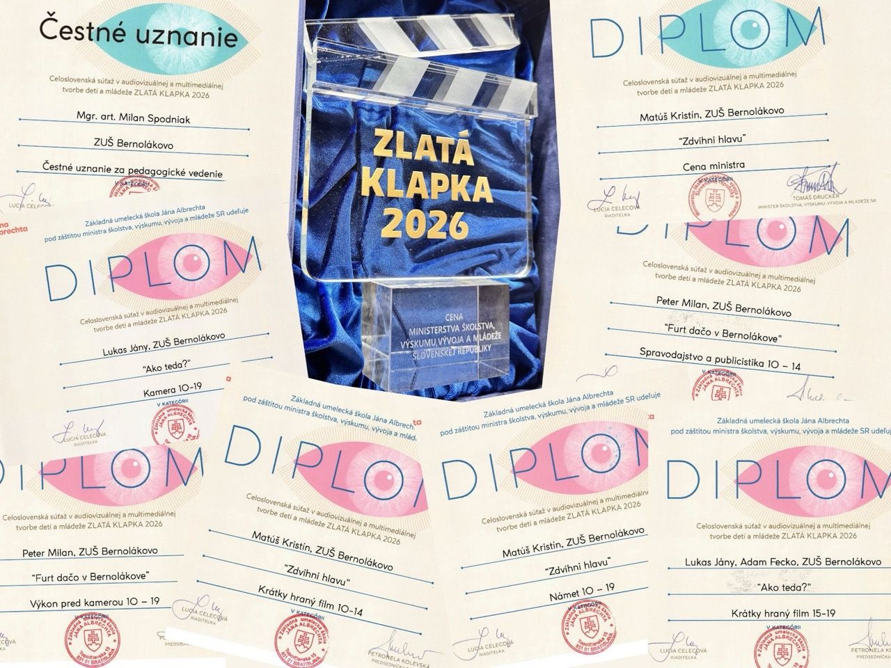 Žiaci odboru audiovizuálnej a multimediálnej tvorby Základnej umeleckej školy Bernolákovo dosiahli výrazný úspech na 14. ročníku celoslovenskej súťaže v audiovizuálnej a multimediálnej tvorbe detí a mládeže – Zlatá klapka 2026. Svoje práce prihlásili do siedmich súťažných kategórií, pričom zvíťazili v šiestich z nich a okrem toho získali hlavnú cenu súťaže – Cenu ministra školstva, výskumu, vývoja a mládeže Slovenskej republiky. Galavečer vyhlasovania výsledkov a workshop súťaže sa konal 19. marca 2026 v Dome kultúry Zrkadlový háj.