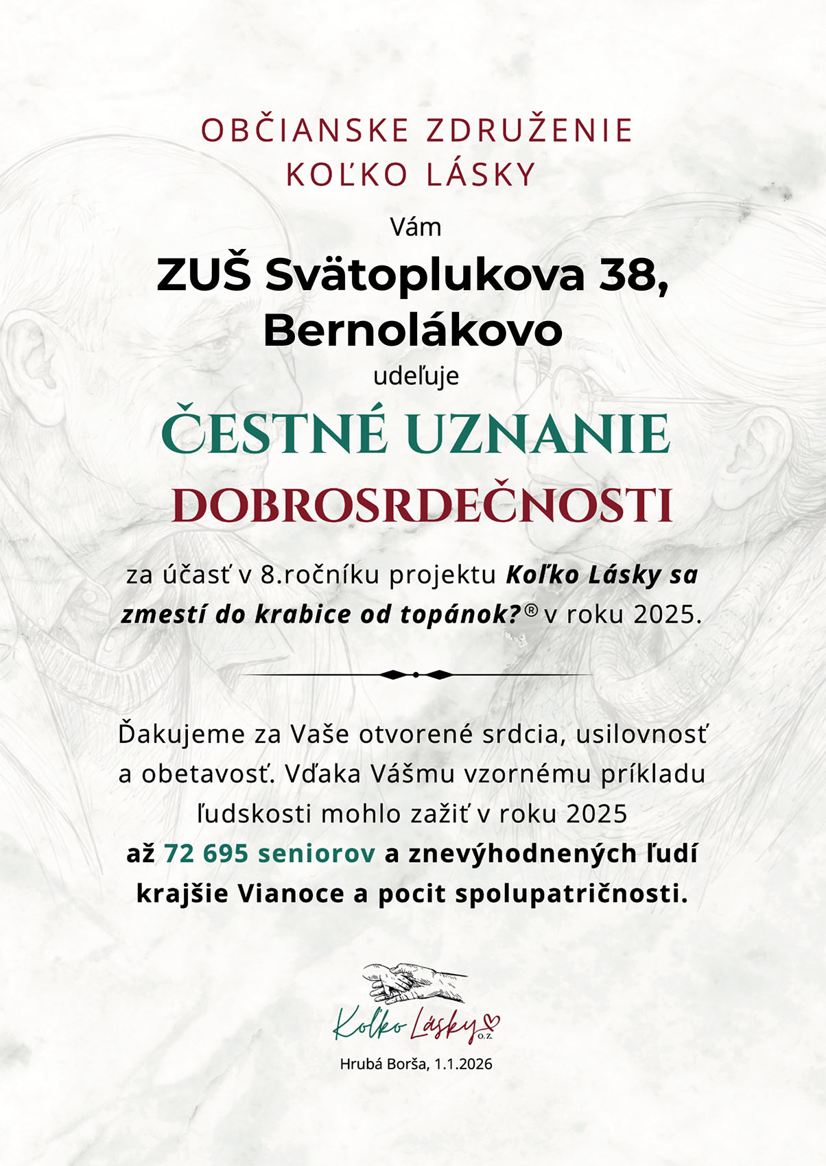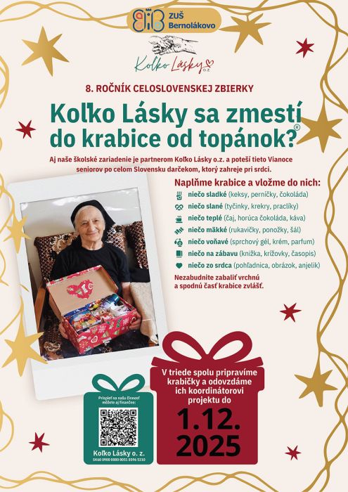 ZUŠ Bernolákovo sa v roku 2025 zapojila do 8. ročníka úspešnej celoslovenskej zbierky s názvom „Koľko Lásky sa zmestí do krabice od topánok?“, ktorá prebiehala pre školy do 1. 12. 2025. Vyzbieraných bolo 14 krabičiek plných lásky a namaľovaných 164 vianočných pohľadníc z ateliéru výtvarného odboru, ktoré potešili slovenských seniorov v domovoch dôchodcov a iných opatrovateľských a nemocničných zariadeniach v našom okrese a spríjemníte im tohtoročné Vianoce.
