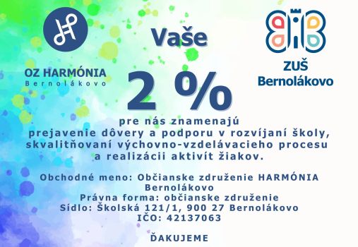 s dôverou sa na Vás obraciame v mene Občianskeho združenia HARMÓNIA Bernolákovo, ktoré pôsobí pri ZUŠ Bernolákovo, s prosbou o poukázanie 2 % z Vašich daní na skvalitňovanie výchovno-vzdelávacieho procesu a podporu aktivít žiakov našej školy.
